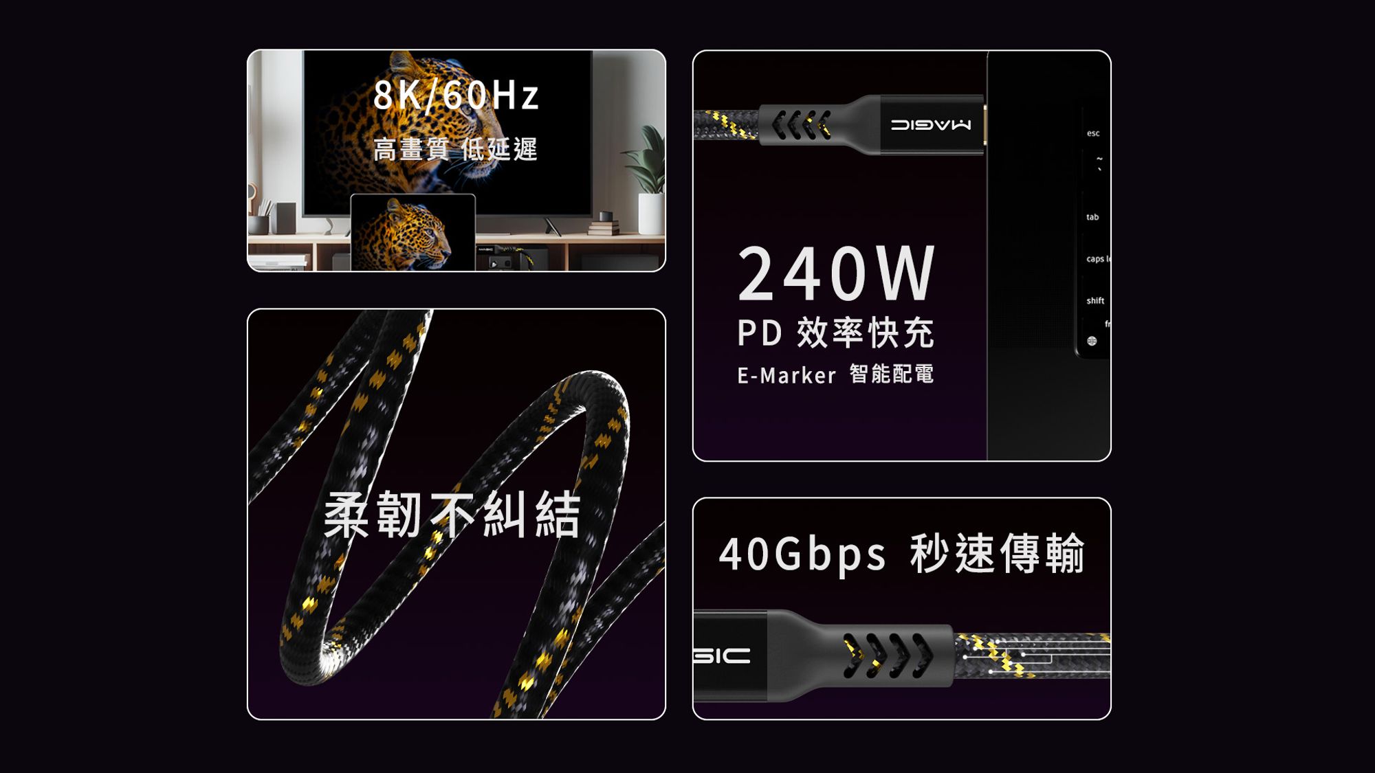 MAGIC USB-C 240W USB 40Gbps 快充傳輸編織線 1.2M/1.8M 箔金黑
